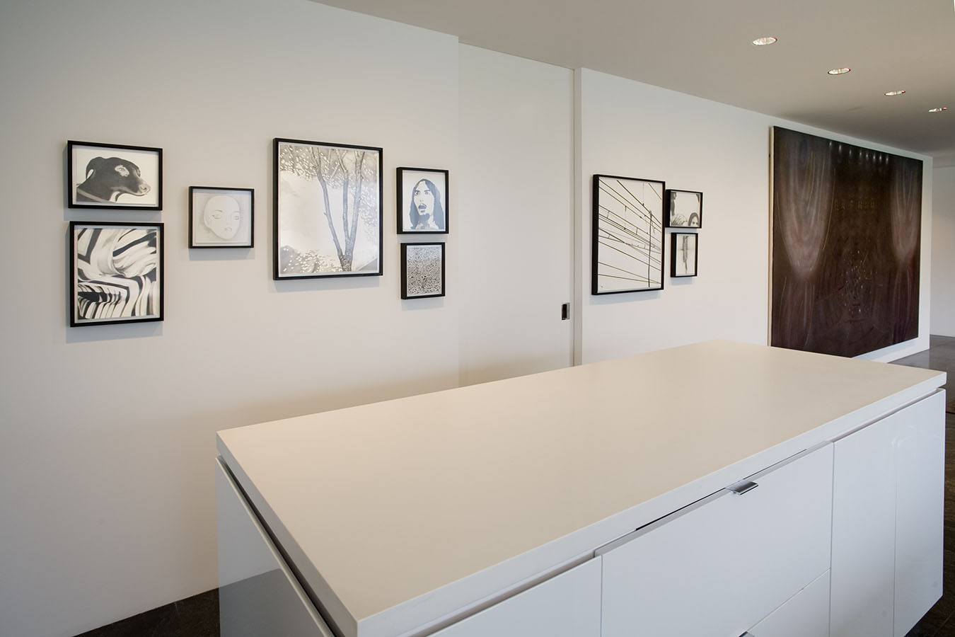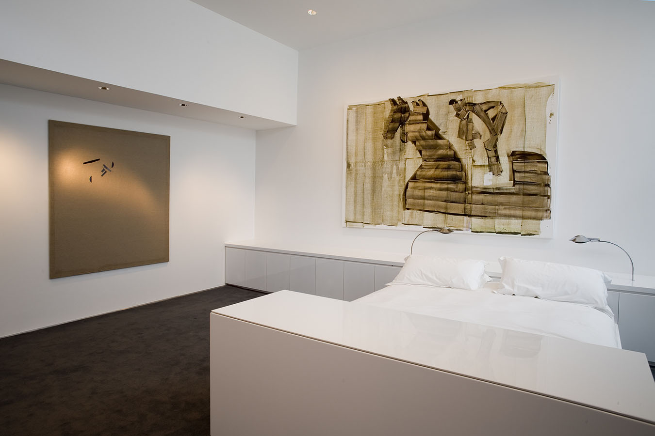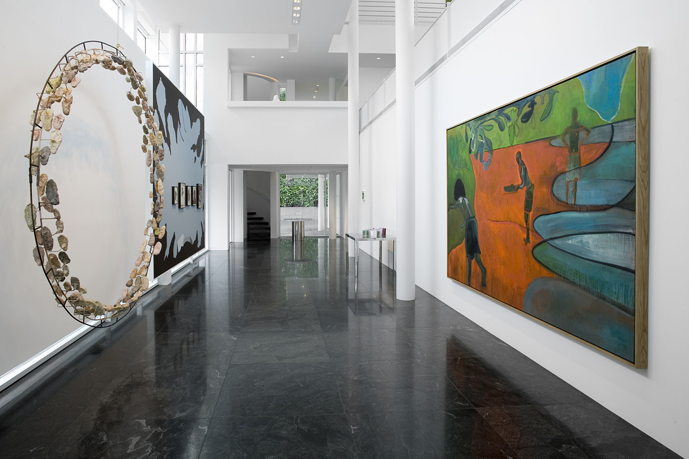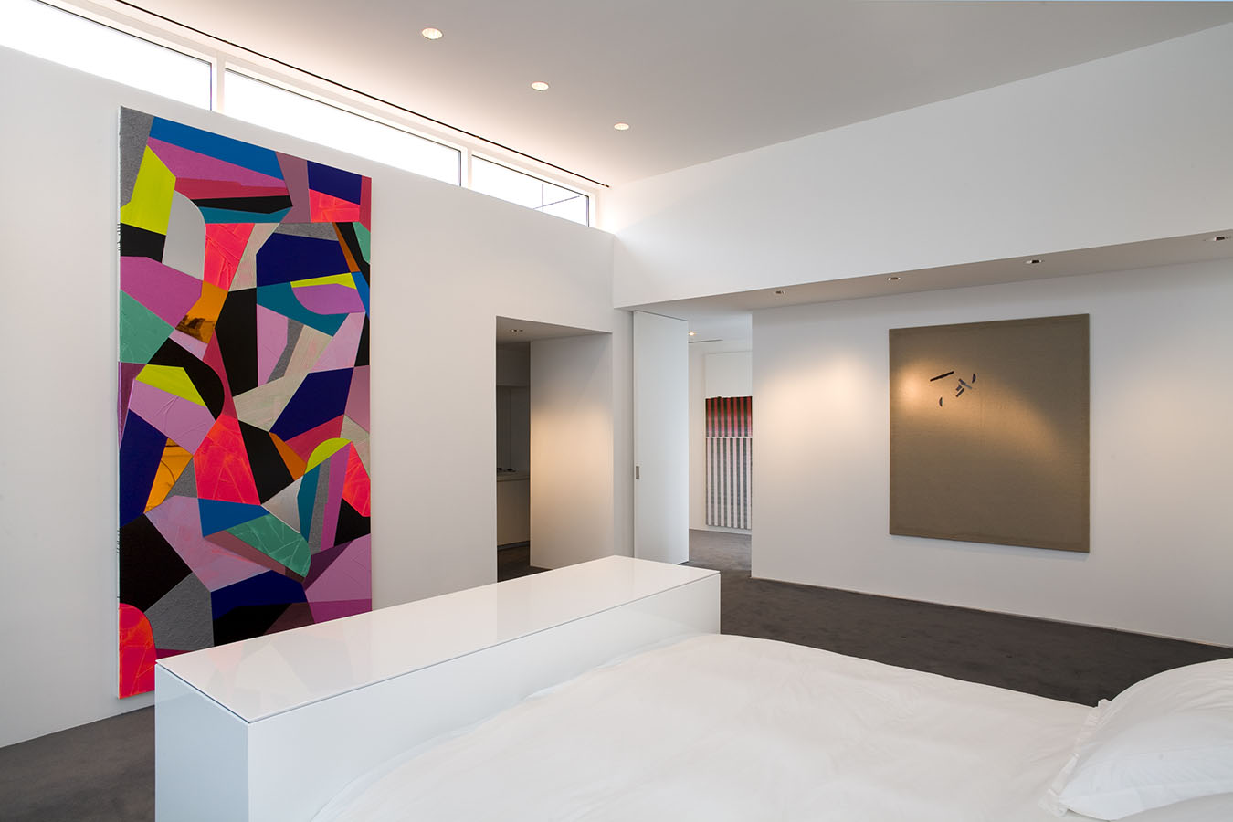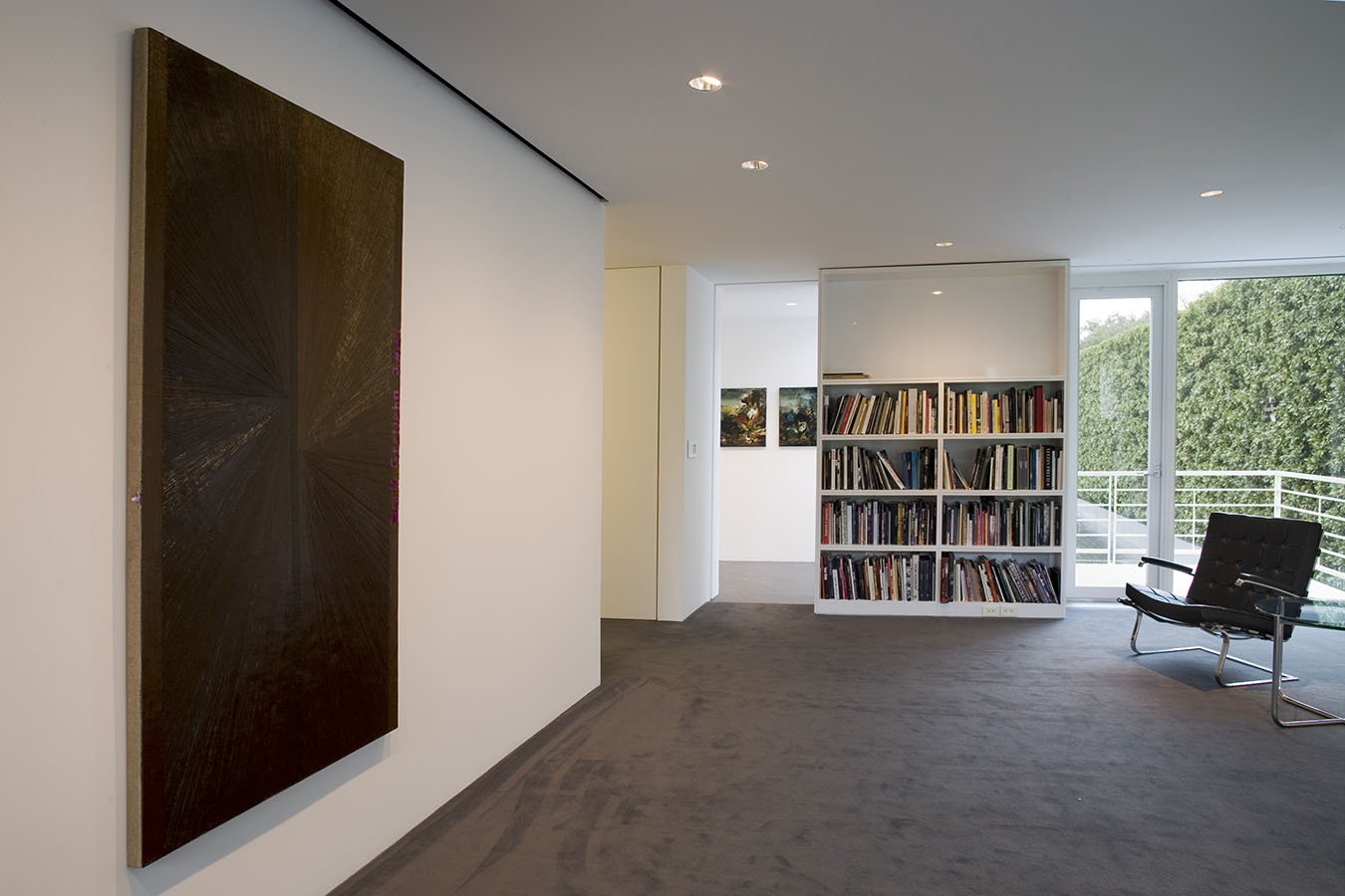 The works in the living room all explore portraiture—or, more accurately, self-portraiture, be it real or metaphoric. The library is devoted to the work of a single artist, Mark Grotjahn, who has found his own personal, exquisite, and often transcendent way of invigorating painting, while the painting, sculpture, and photograph in the back corridor display a pinpoint delicacy that is characteristic of this moment's comfort with subtlety, complexity, and the uncertain. The painters whose work is in the master bath and gym are working in ways that place equal value on representation and abstraction, and that favor the subtle and uncertain over the definitive and precise. And works in the master bedroom—even the representational one—search for ways to reinvigorate the medium of painting—pure painting—from the inside out.