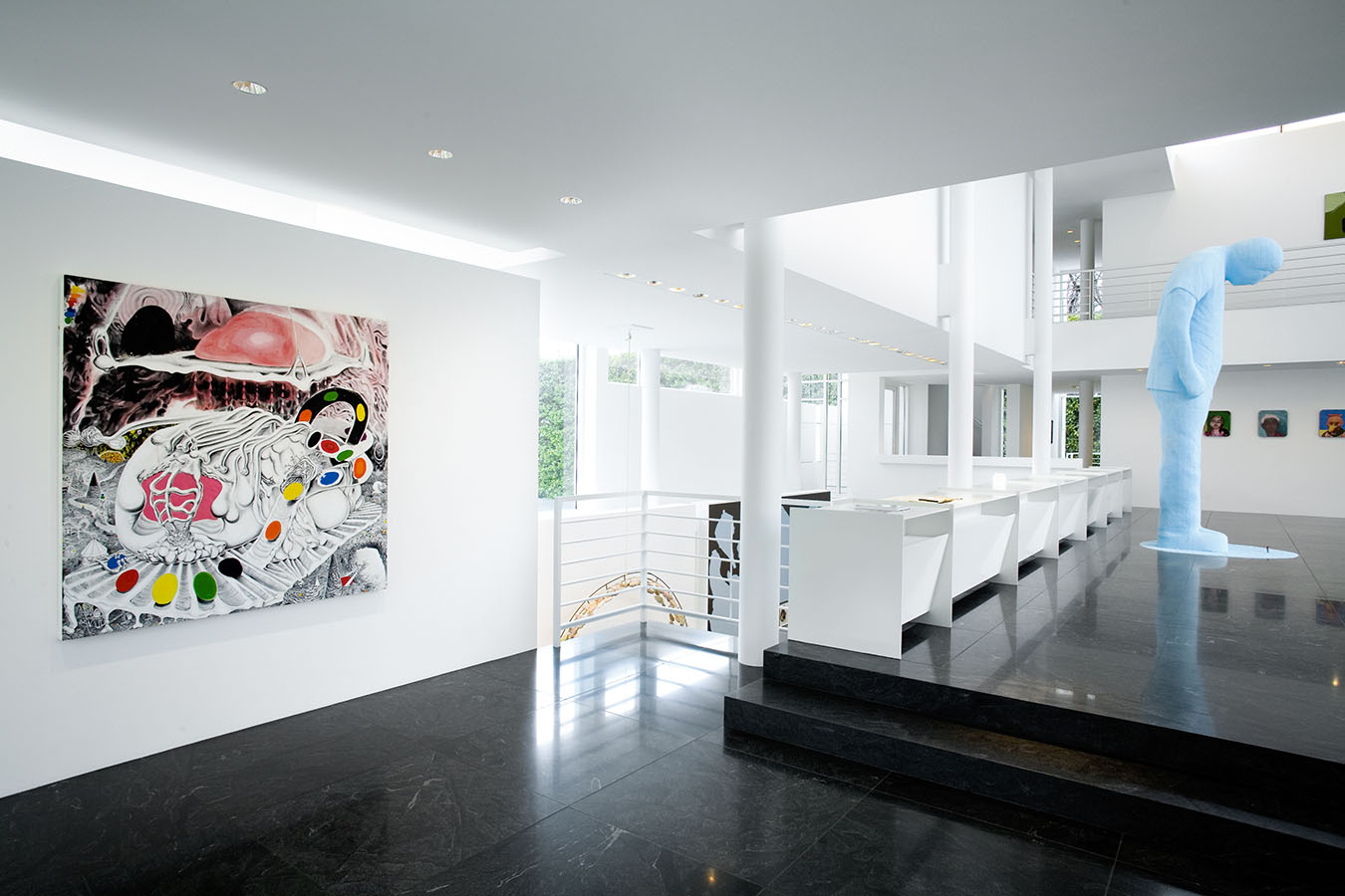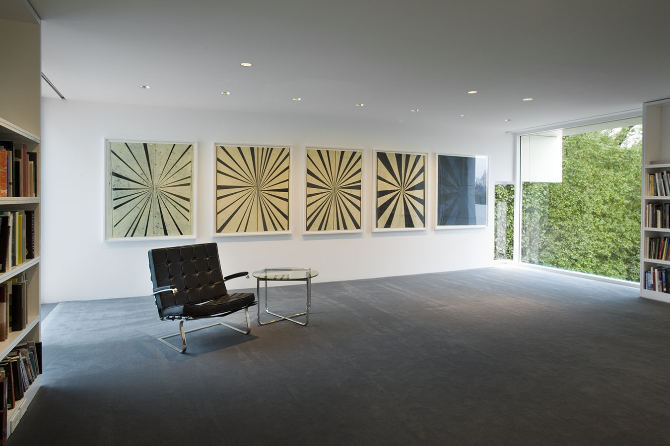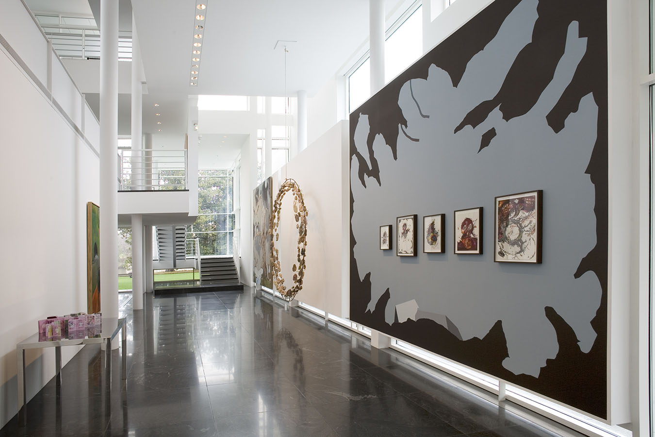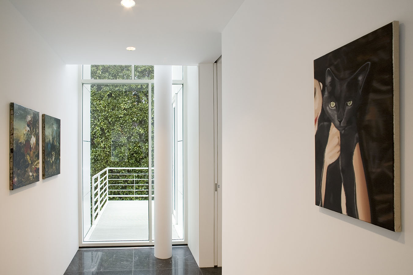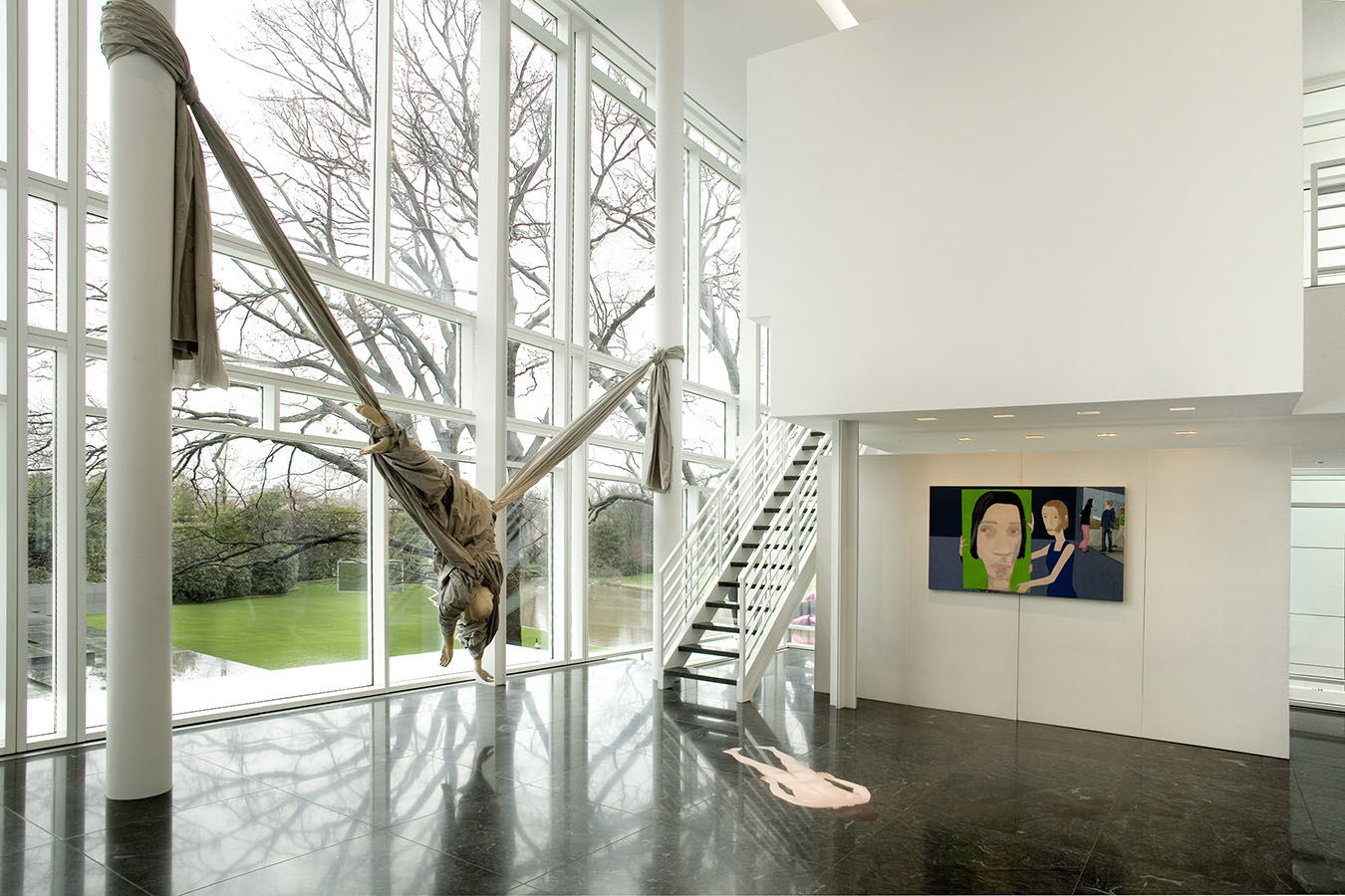 The works in the living room all explore portraiture—or, more accurately, self-portraiture, be it real or metaphoric. The library is devoted to the work of a single artist, Mark Grotjahn, who has found his own personal, exquisite, and often transcendent way of invigorating painting, while the painting, sculpture, and photograph in the back corridor display a pinpoint delicacy that is characteristic of this moment's comfort with subtlety, complexity, and the uncertain. The painters whose work is in the master bath and gym are working in ways that place equal value on representation and abstraction, and that favor the subtle and uncertain over the definitive and precise. And works in the master bedroom—even the representational one—search for ways to reinvigorate the medium of painting—pure painting—from the inside out.