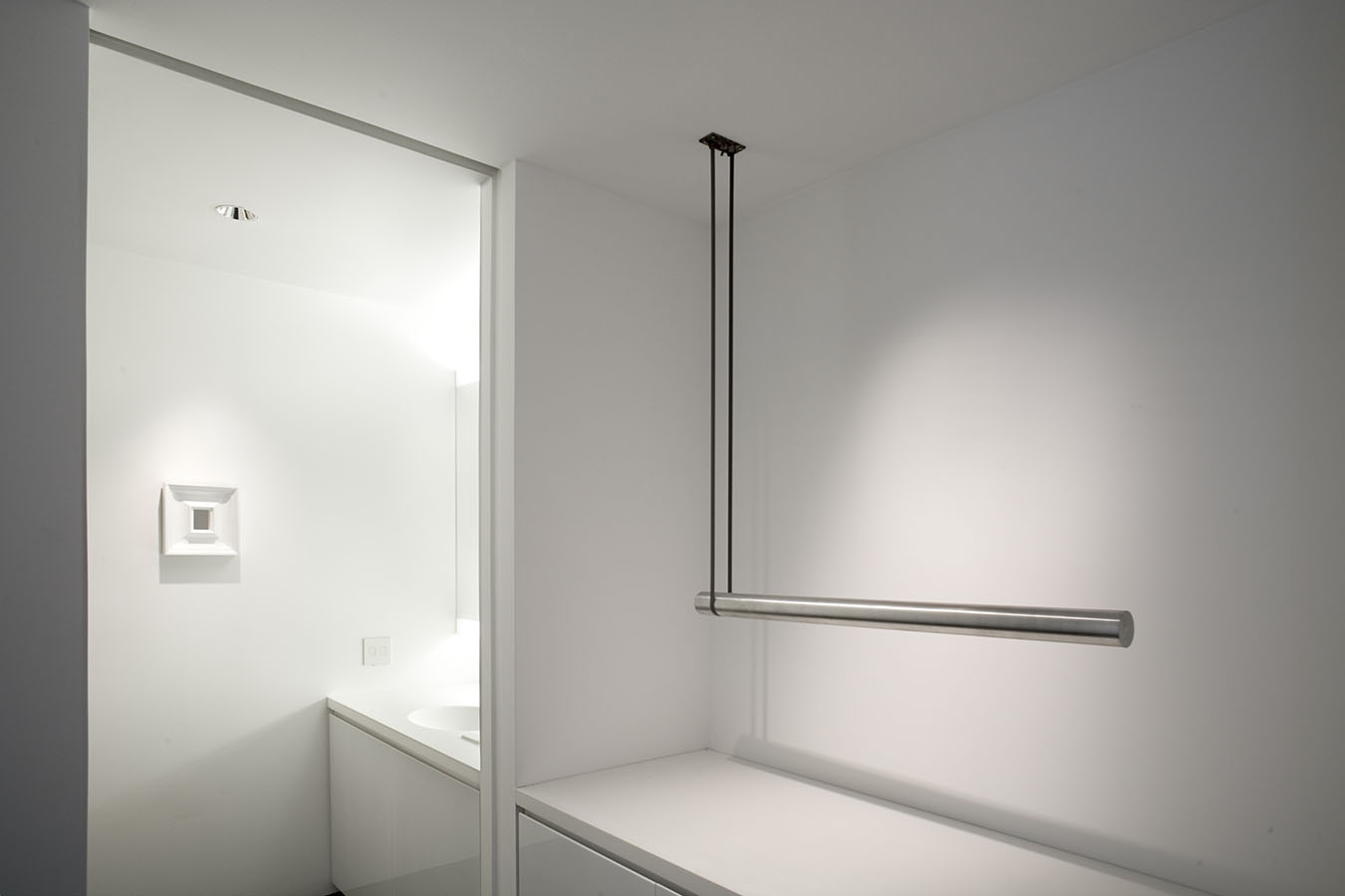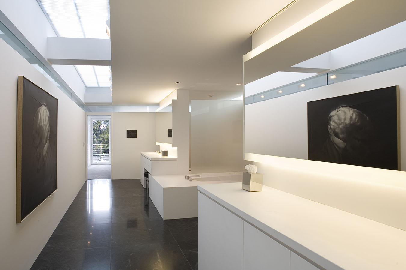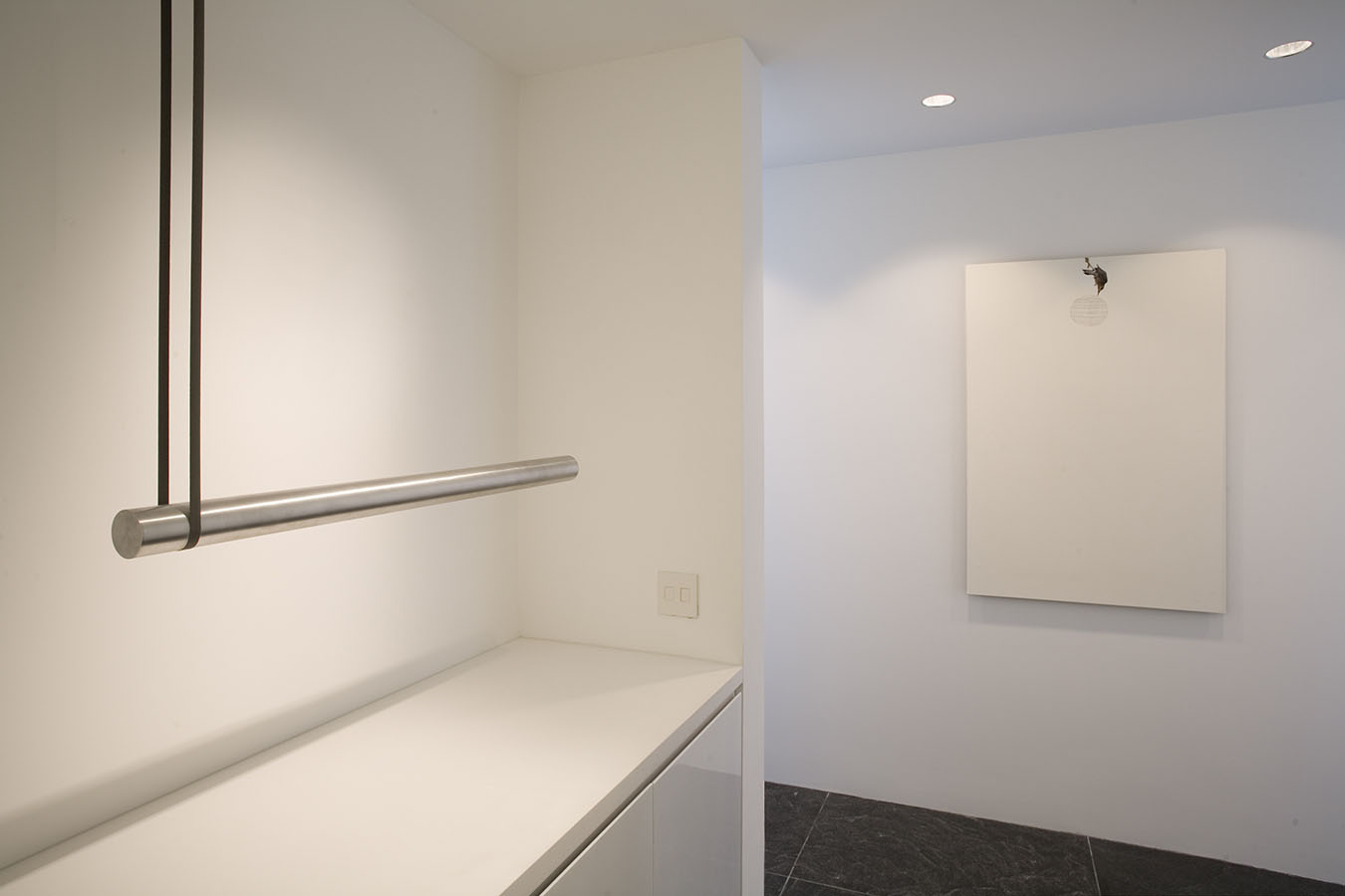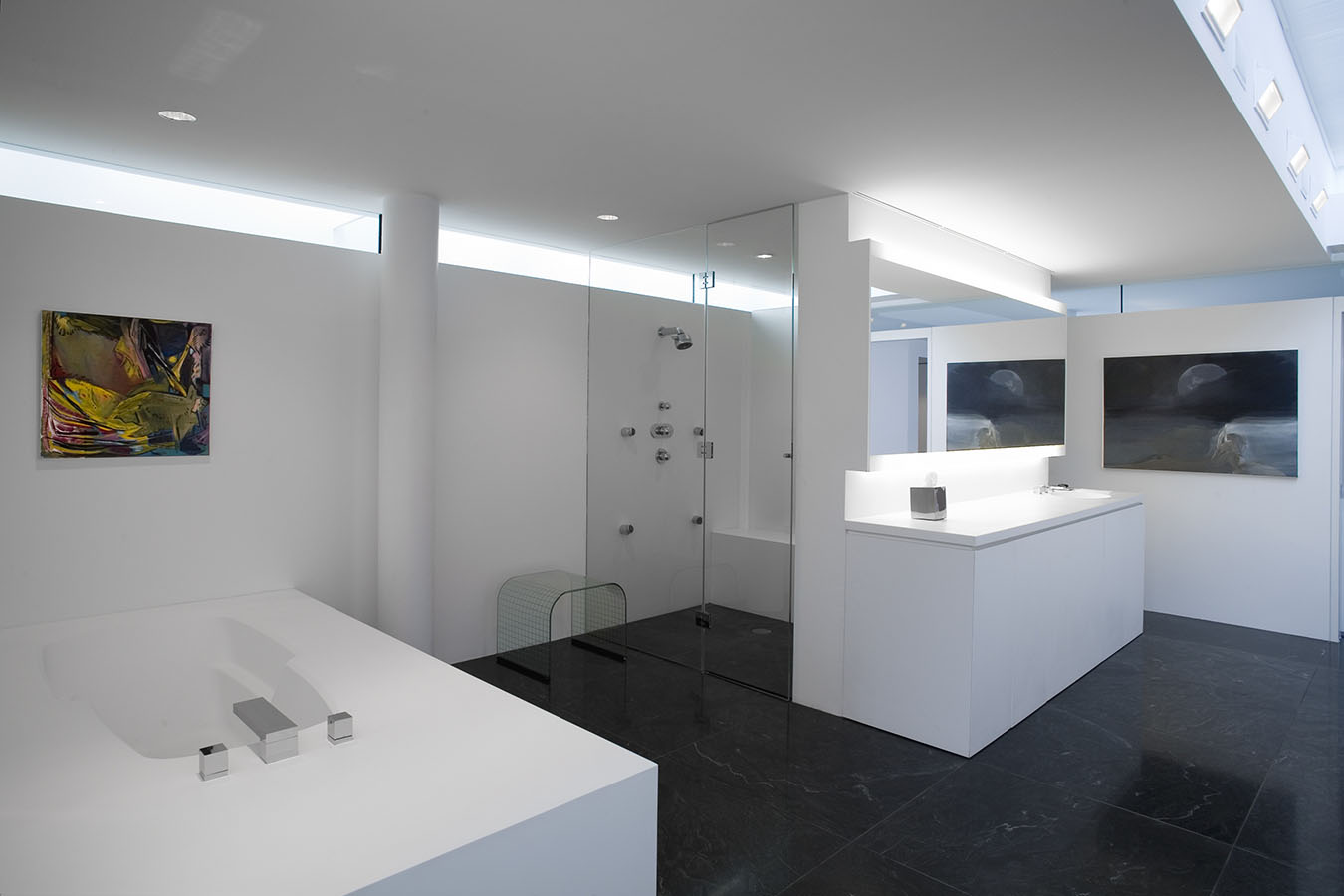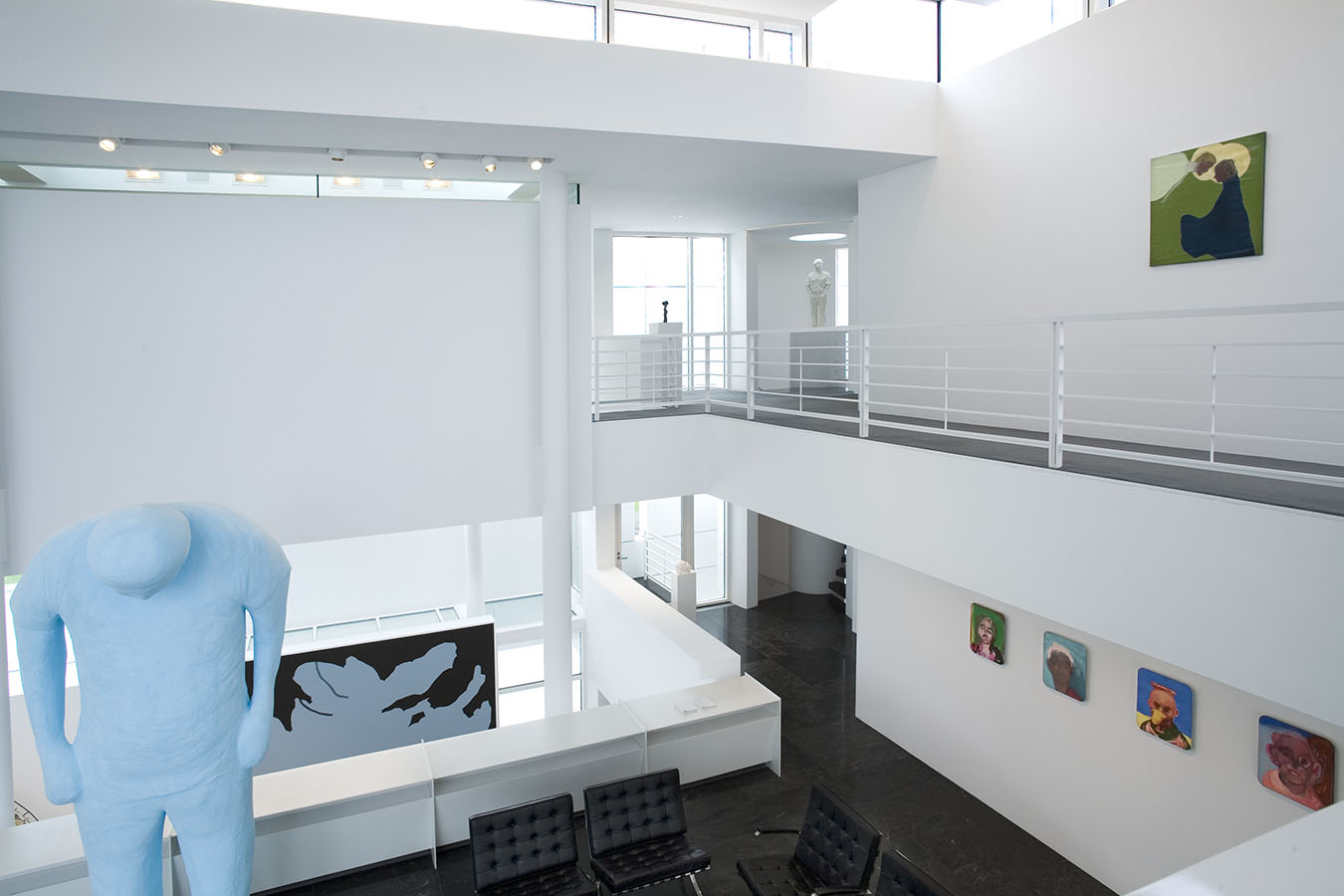 The works in the living room all explore portraiture—or, more accurately, self-portraiture, be it real or metaphoric. The library is devoted to the work of a single artist, Mark Grotjahn, who has found his own personal, exquisite, and often transcendent way of invigorating painting, while the painting, sculpture, and photograph in the back corridor display a pinpoint delicacy that is characteristic of this moment's comfort with subtlety, complexity, and the uncertain. The painters whose work is in the master bath and gym are working in ways that place equal value on representation and abstraction, and that favor the subtle and uncertain over the definitive and precise. And works in the master bedroom—even the representational one—search for ways to reinvigorate the medium of painting—pure painting—from the inside out.