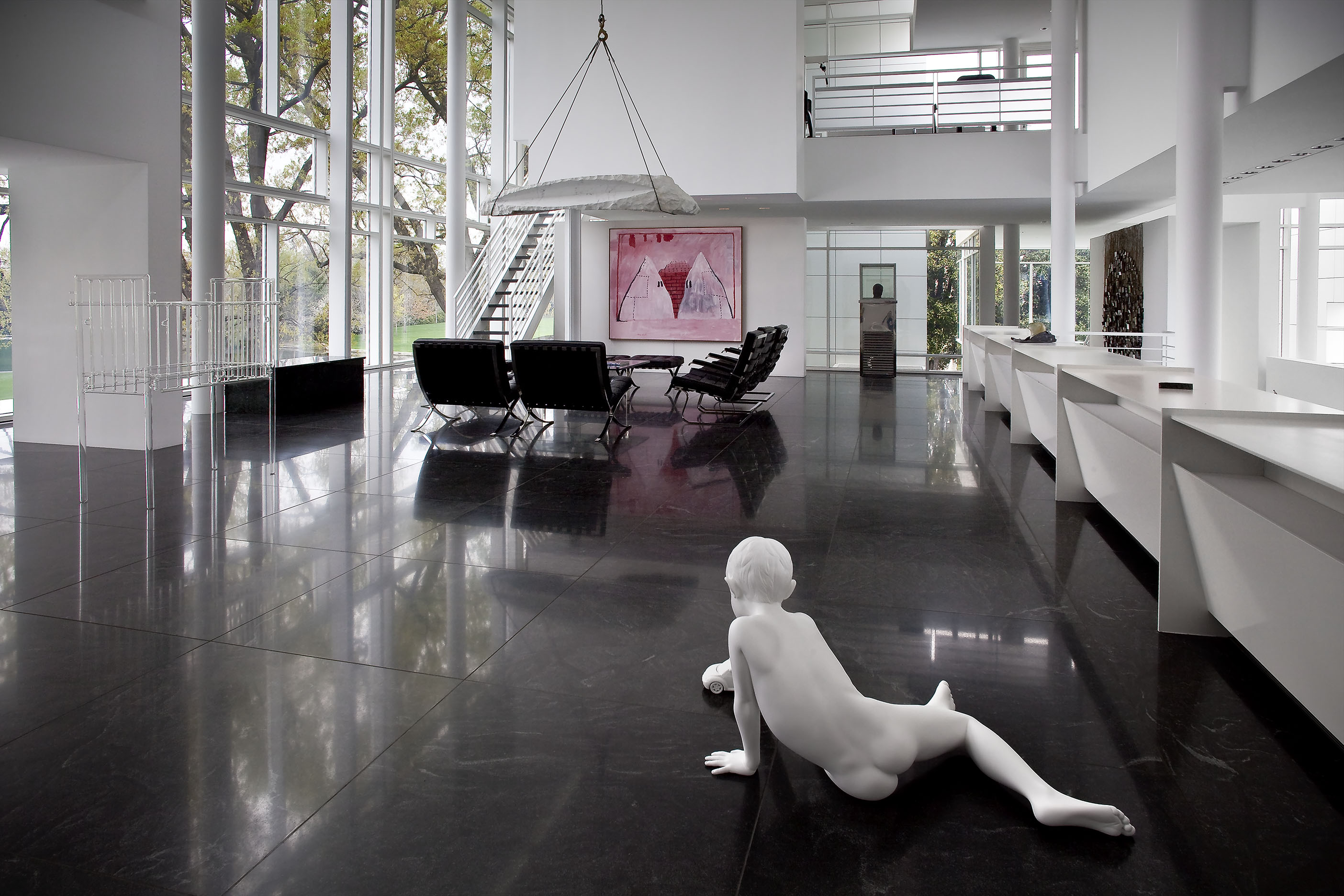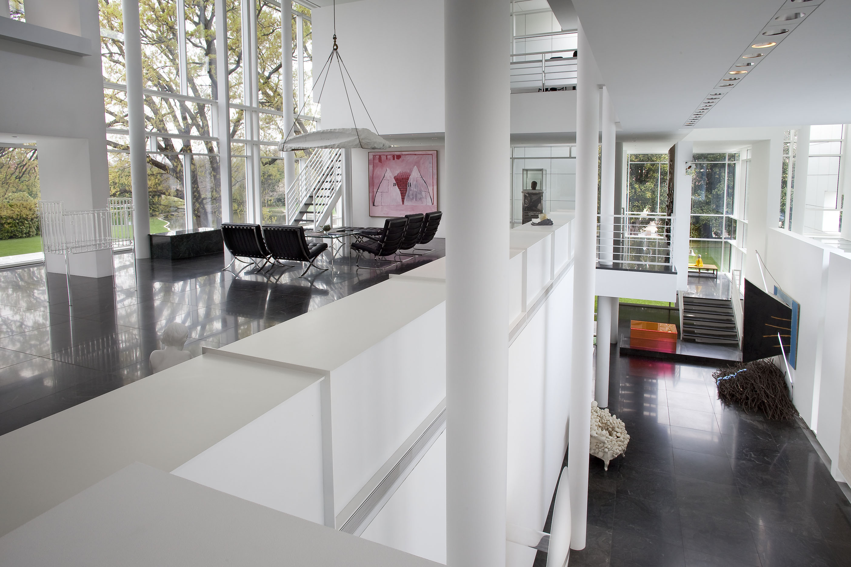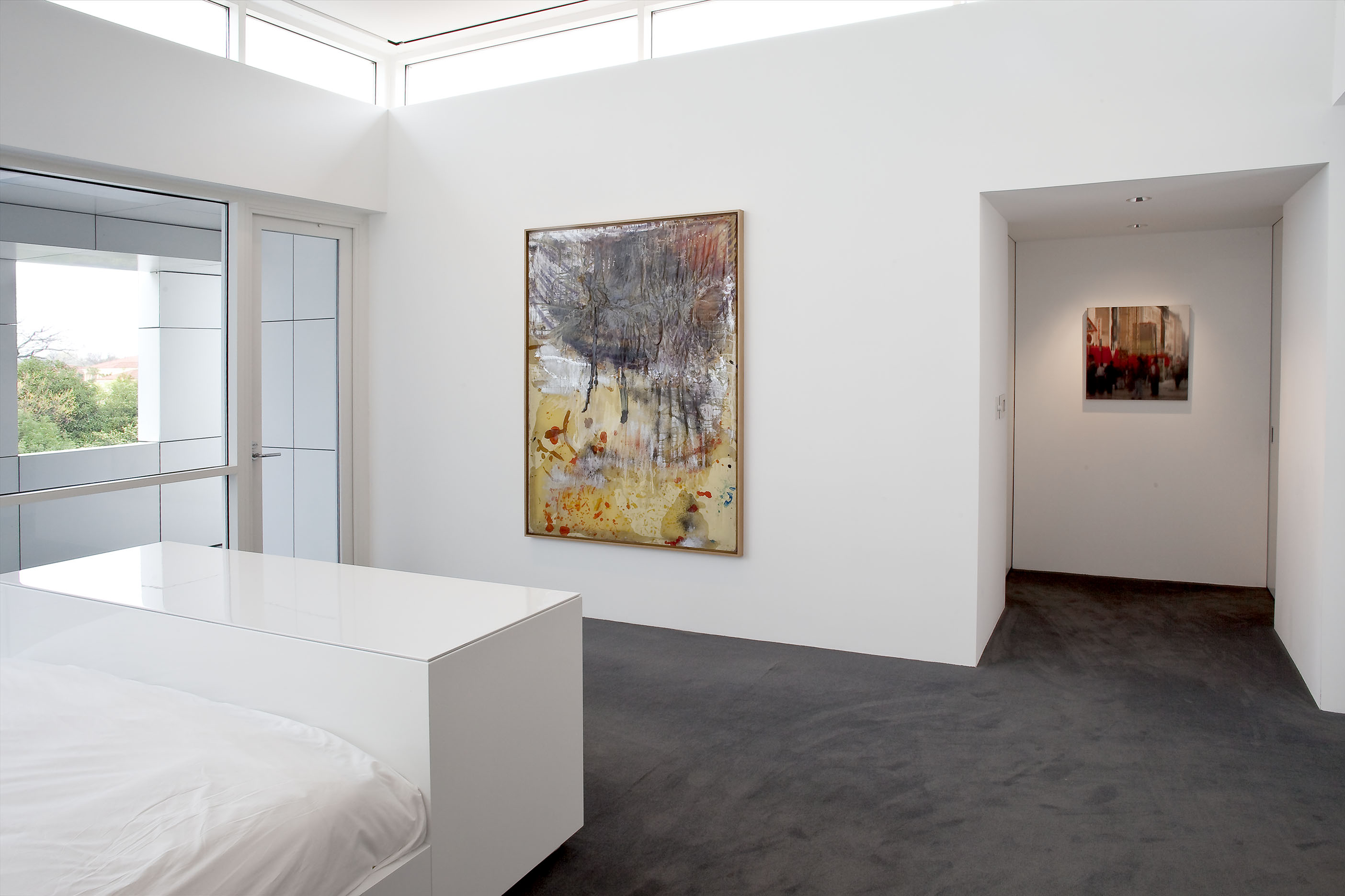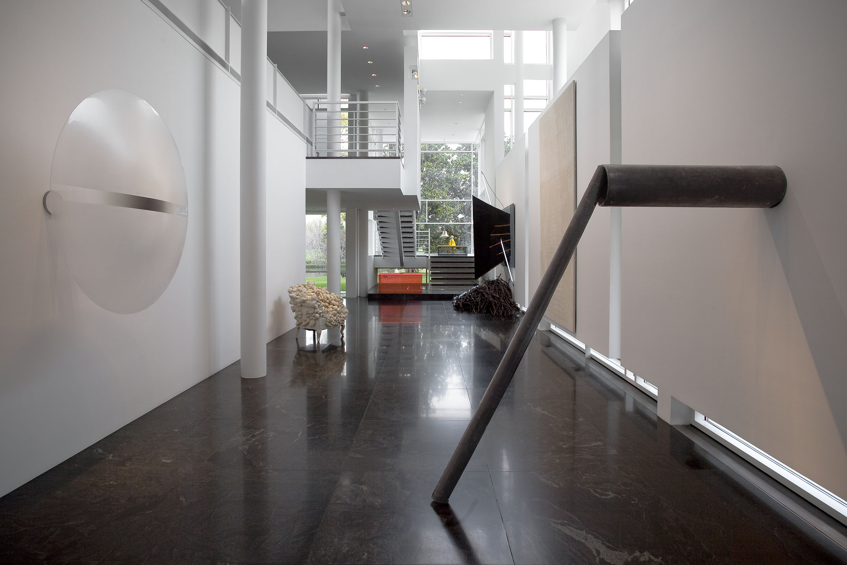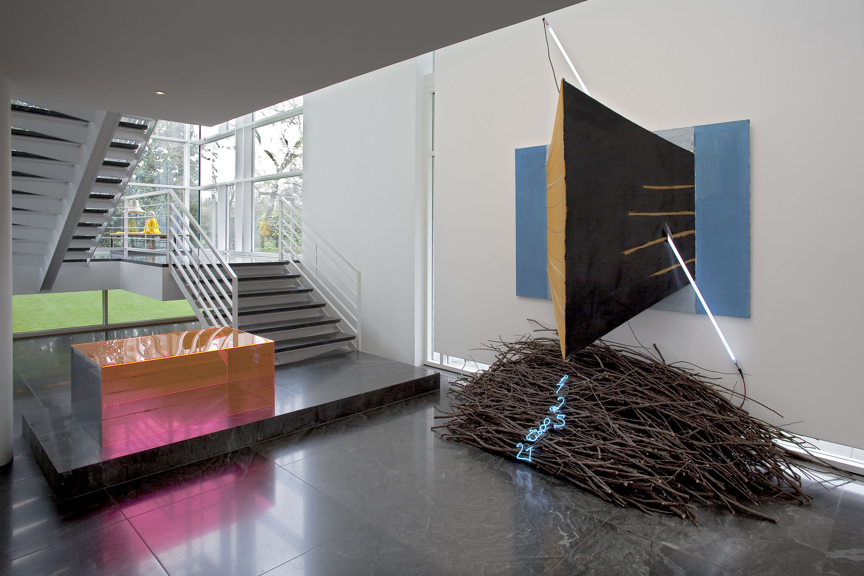 The stair landing, second-floor sitting room, and the second-floor back hallway explore the more psychological sides of the collection, with works from the 1960s through the 1990s that delve into the examination of the self and identity in late modern and postmodern art. In a related vein, the works in the living room look at the self in relation to architecture and the society that creates it. In contrast, the library contains the most essential nonobjective works from Europe and the United States of the 1950s and 60s, paintings and objects that set the stage for the larger and somewhat later works of the entrance gallery.