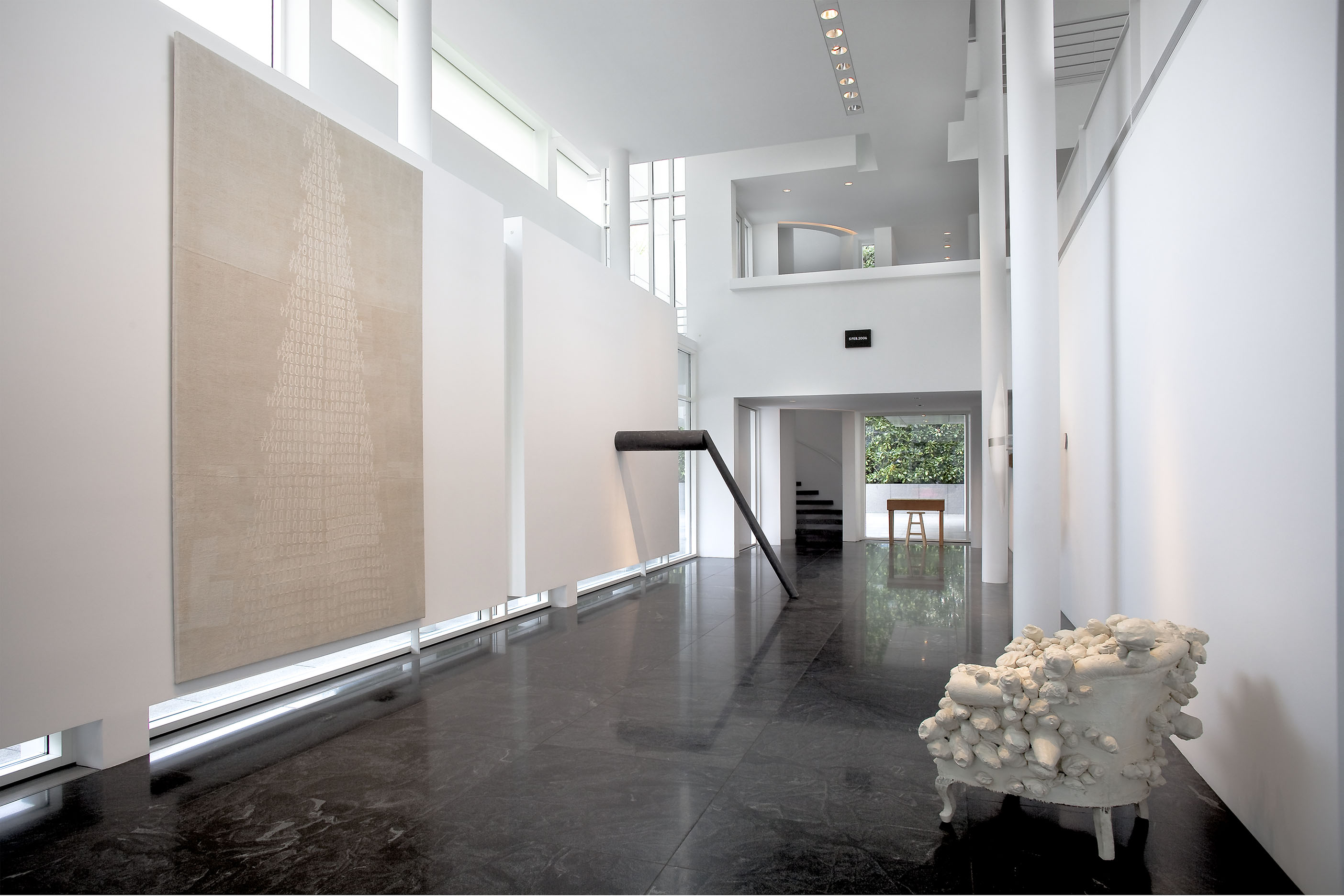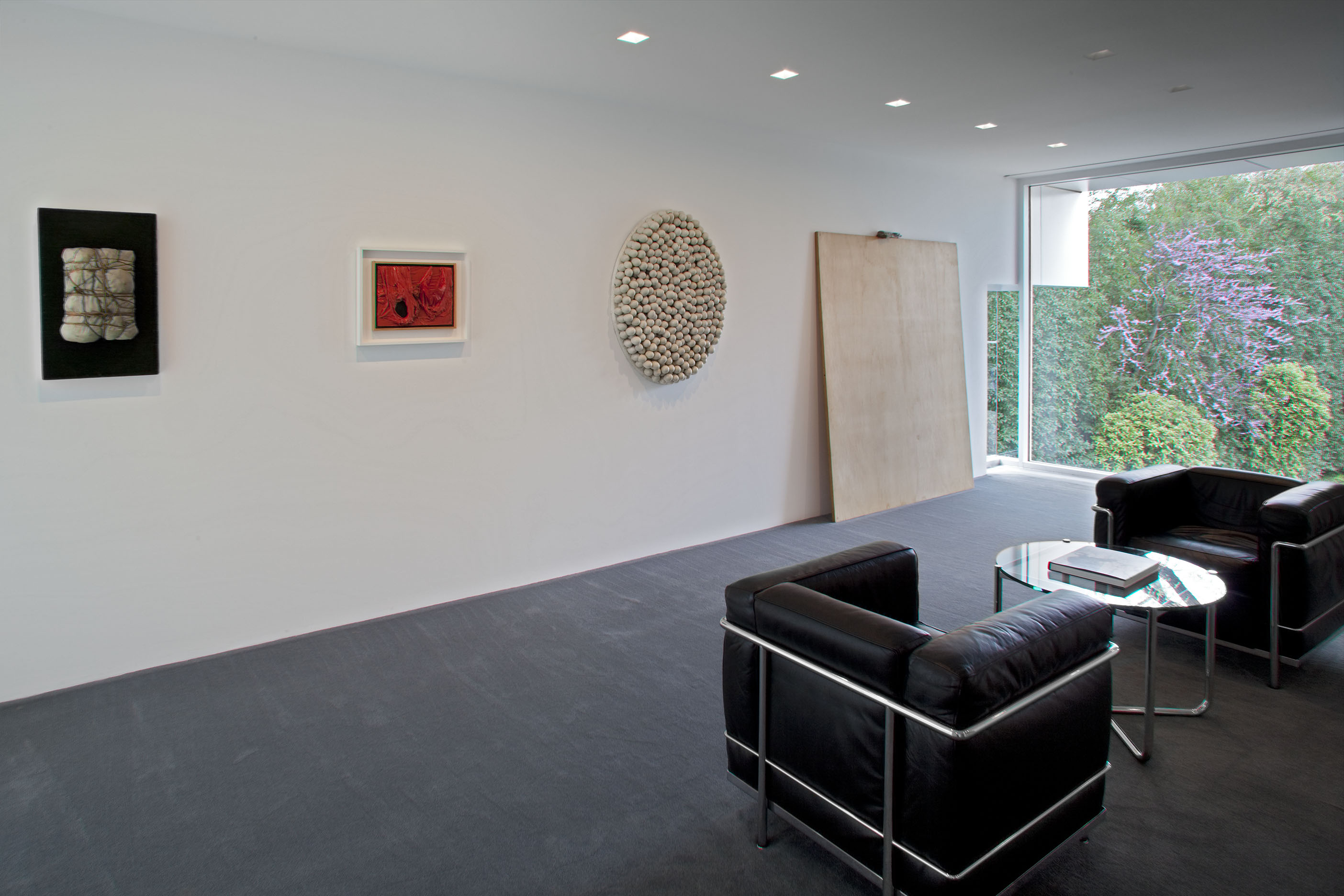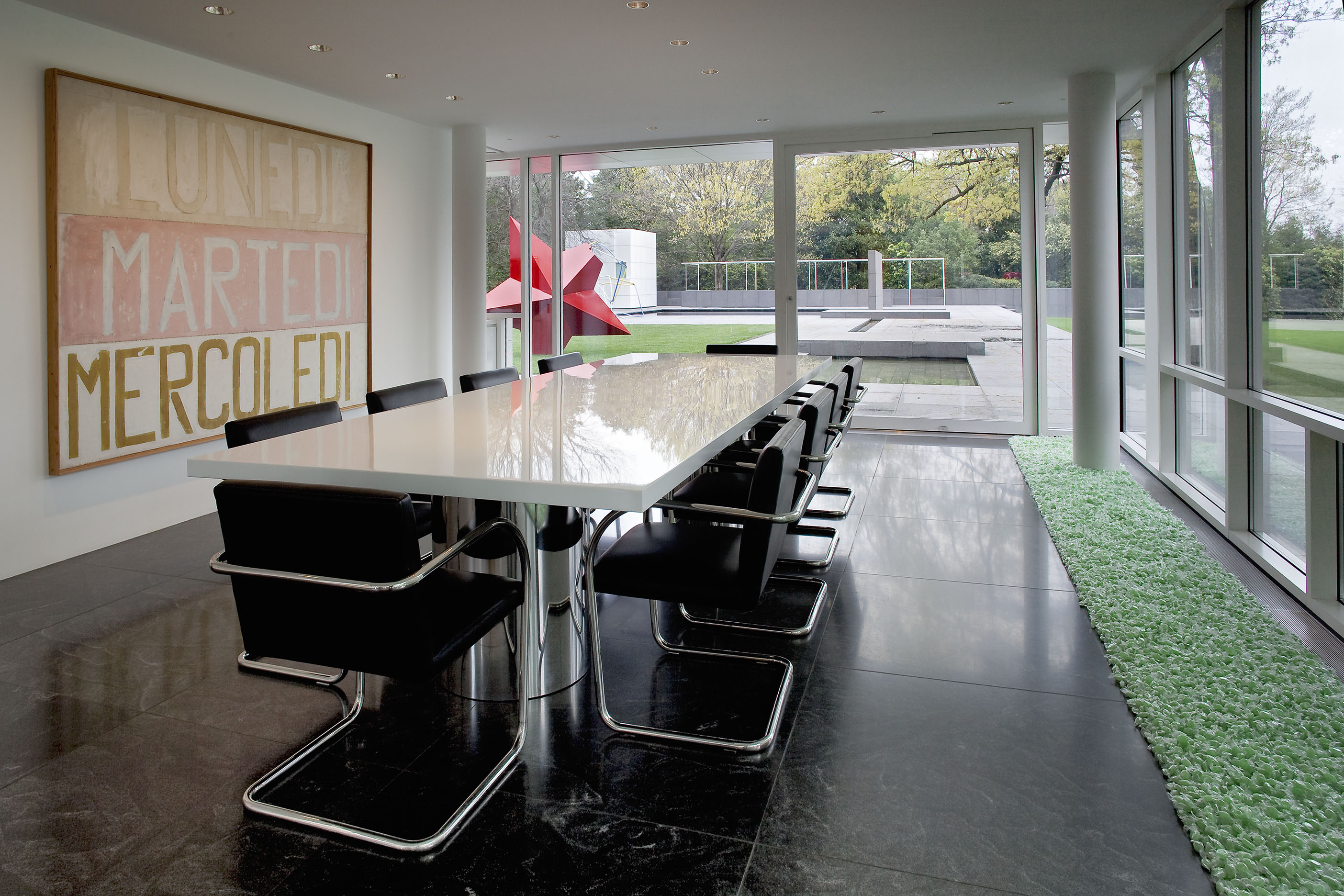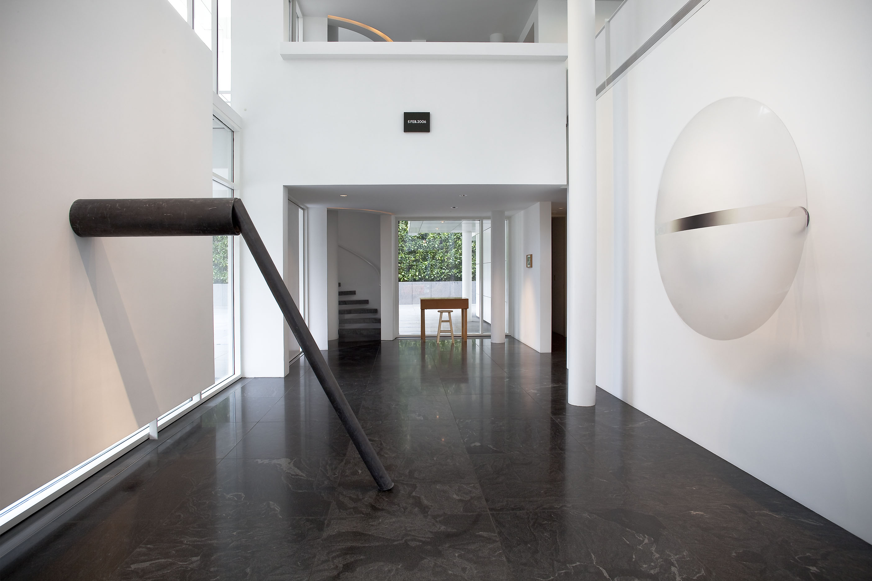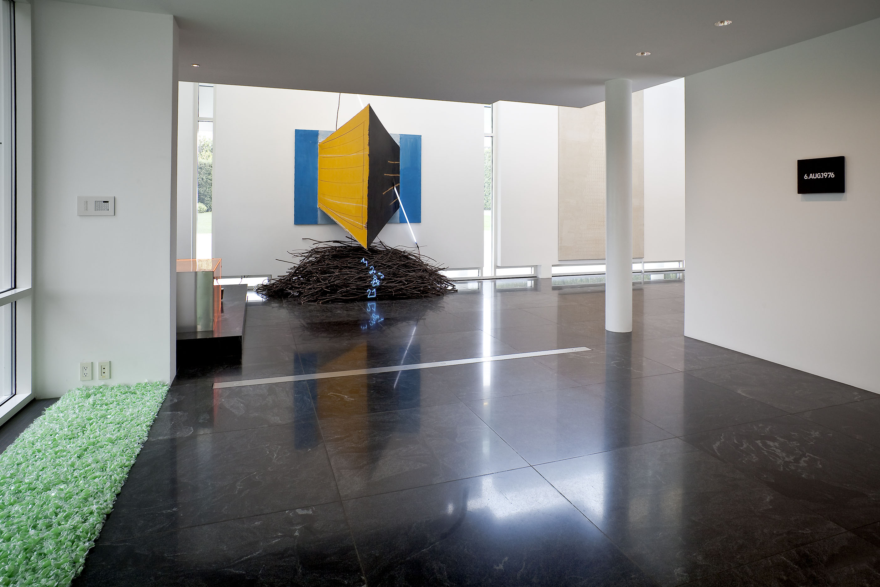 Each room focuses on a different aspect of the collection. The entrance gallery and dining room feature some of the most historically catalytic works in the collection, including Donald Judd's Untitled (1965), perhaps the first freestanding work that fully articulates the artist's vision; Mario Merz's Vento preistorico dalle montagne (1967), the breakthrough work that is a kind of manifesto in which the artist abandons the rectangle of painting and spills into the real and shared space of the viewer; Robert Irwin's Untitled (1968-69), the work that coalesces the artist's decision to abandon the limits of the object for the limitlessness of perception; Richard Serra's Clothes Pin Prop (1969-76), one of the artist's earliest "prop" works; and Laurie Anderson's Handphone Table-Remembering Sound (1979), a utilitarian-looking table that uses the viewer as a surrogate performer whose body "completes" the work in the process of experiencing it.