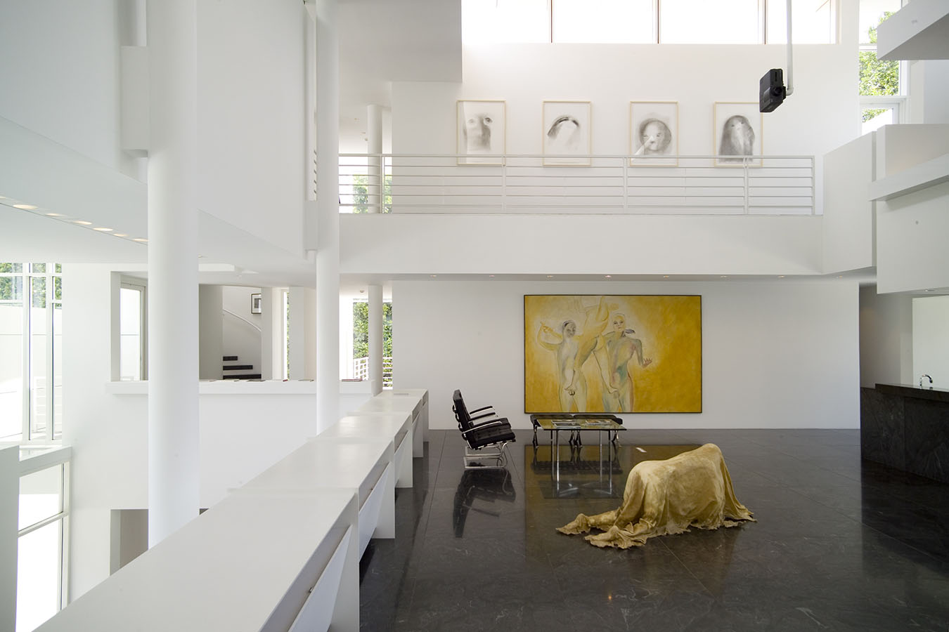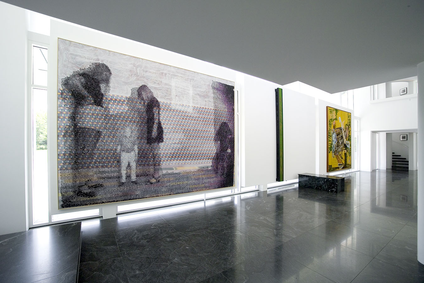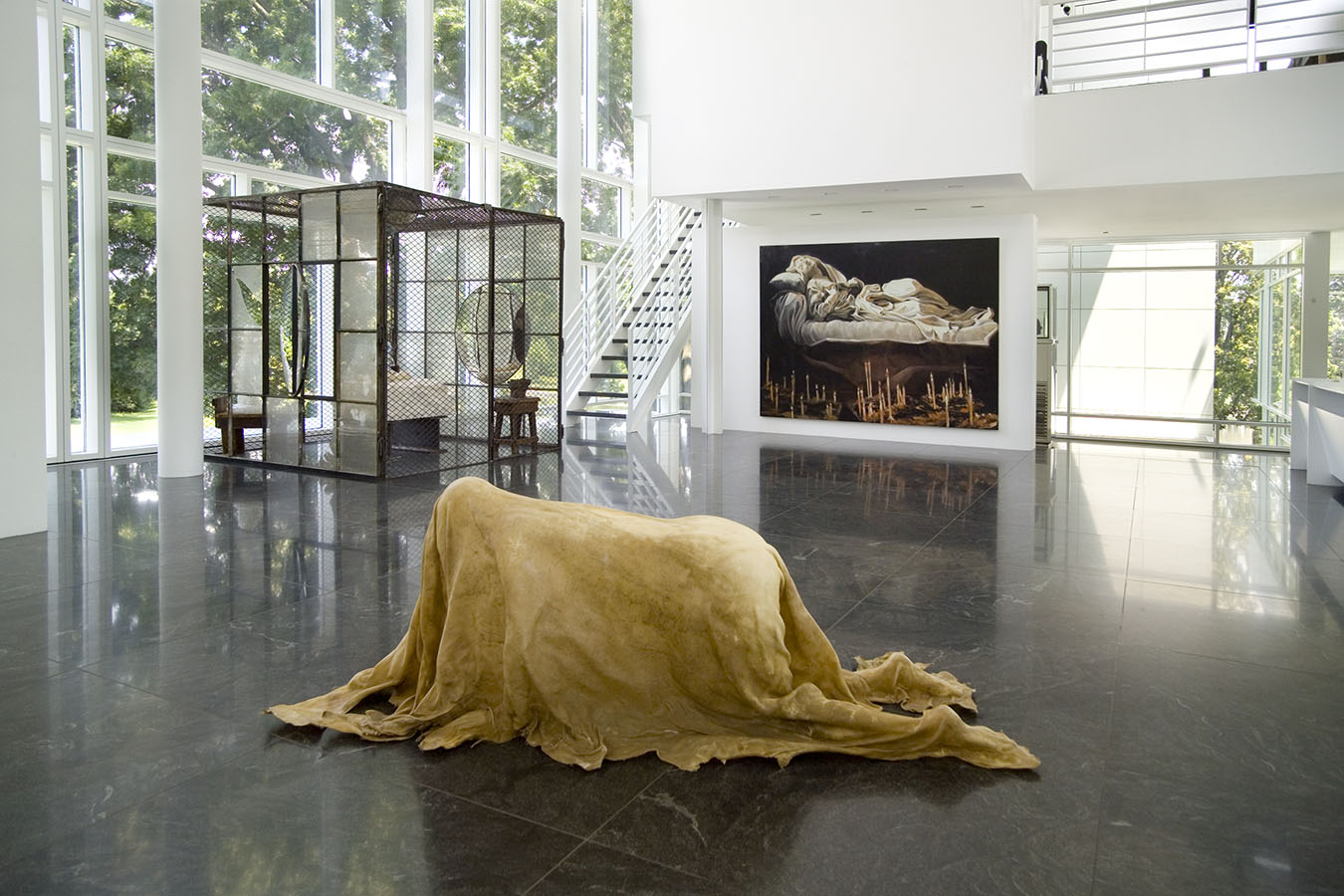 Aptly enough, fragmentation is a pervasive theme throughout the installation. In some spaces, such as the entryway, living room, and library, the psychological heat is intense. In others, like the kitchen, the urge for serenity is central. Many artists (including Sigmar Polke, Francesco Clemente, and Marc Quinn) explore psychological states from a personal perspective. Others (such as Jenny Holzer, Doris Salcedo, and Fred Wilson) use the psychological to examine cultural identity.